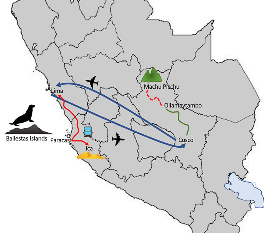 Travel Itinerary: Lima city Paracas Ballestas islands Huacachina oasis Cusco city The Sacred valley & Machu Picchu inca citadel
